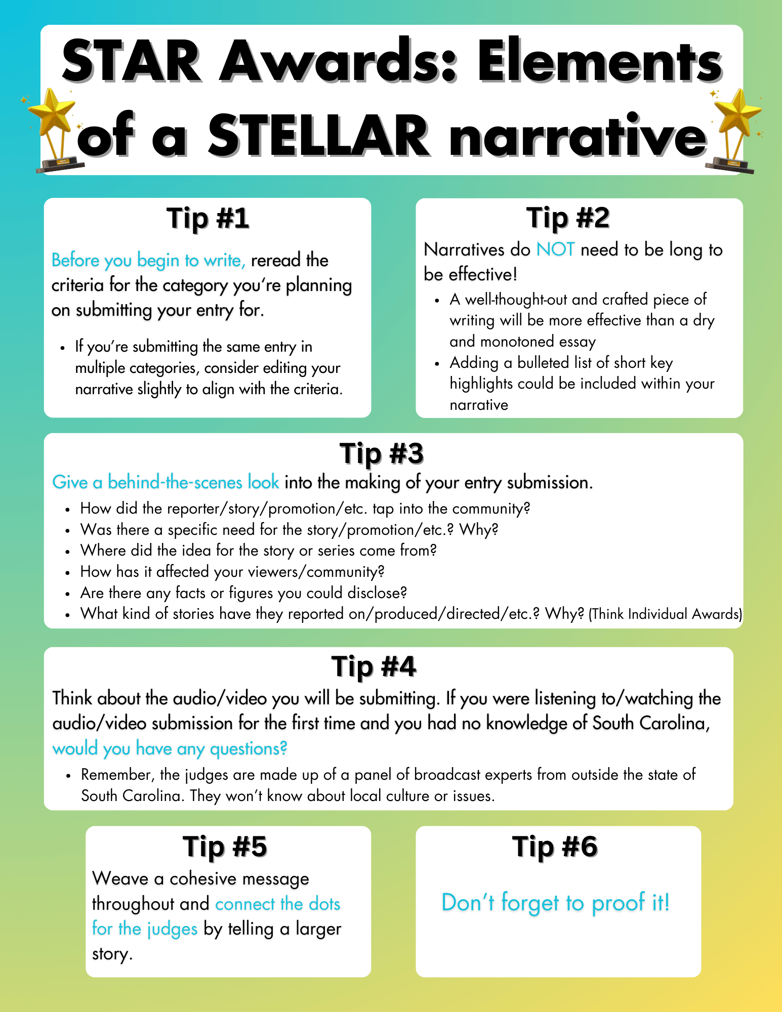 At the STAR Awards, we celebrate the best of the best in South Carolina broadcasting. Your stories have informed, entertained, and inspired our communities. You’ve given voice to the voiceless, shed light on important issues, and brought us together as a state. Your work matters, and it makes a difference. Let’s continue to strive for excellence and serve our communities with passion and integrity. We can’t wait to see your entries for the STAR Awards!